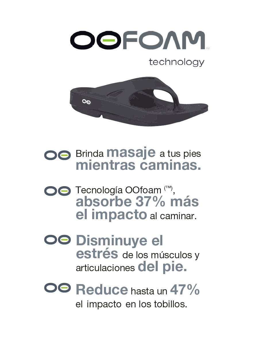Cada par del calzado de recuperación OOFOS se desarrolla utilizando la misma tecnología patentada OOfoam que es el ingrediente que hace que OOFOS sea diferente de otros calzados de confort y nos eleva a una solución científicamente probada, también cuenta con una plantilla patentada que maximiza las propiedades de la espuma.